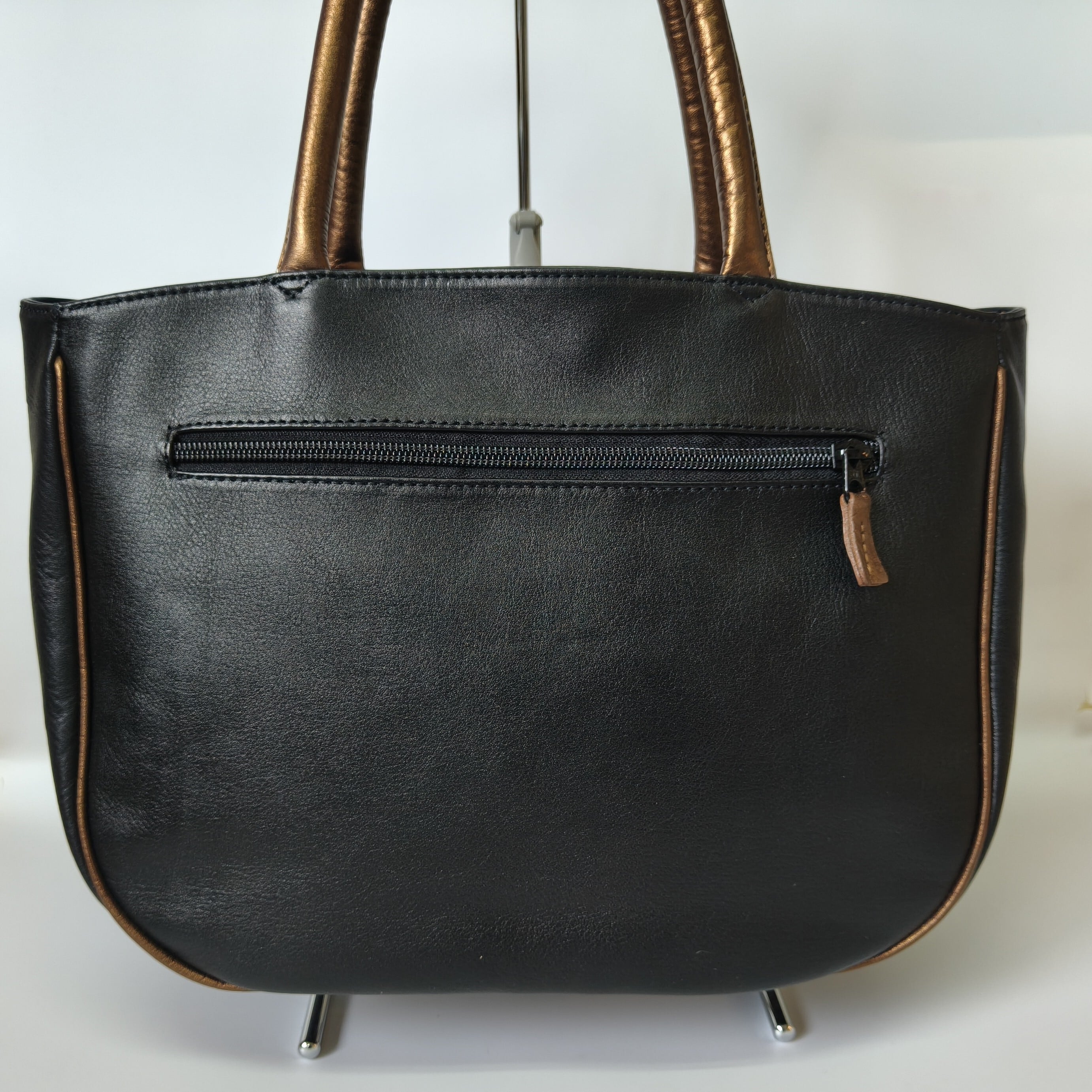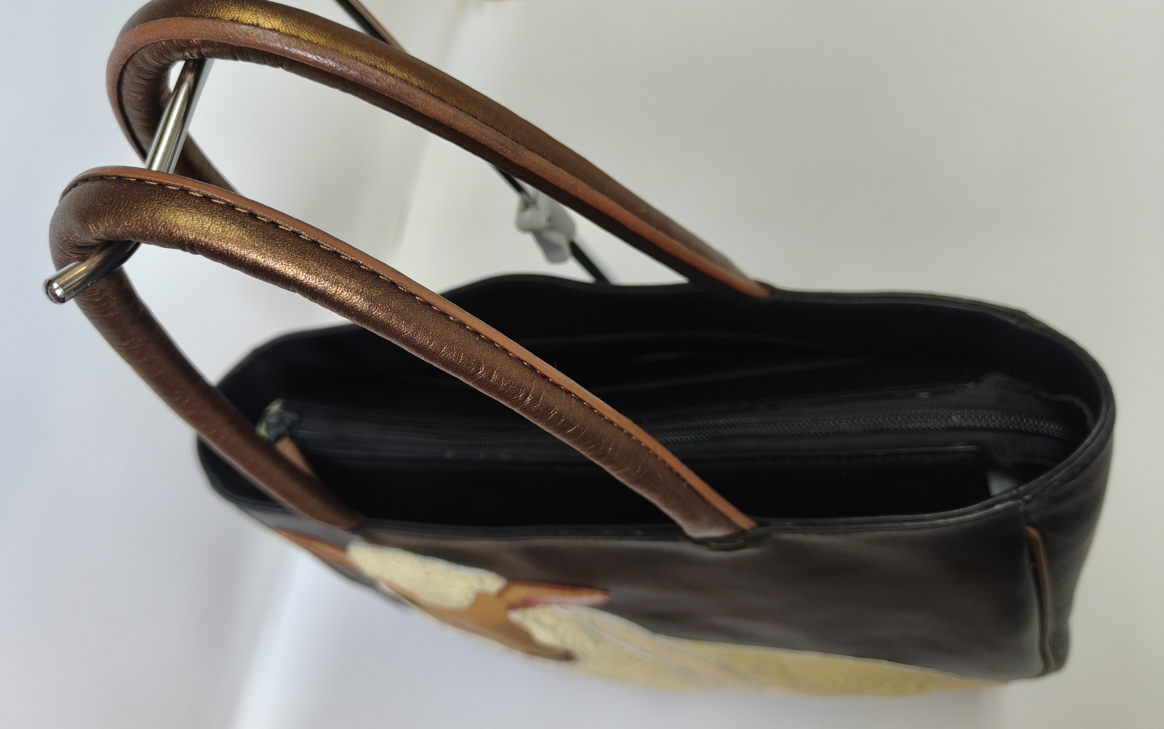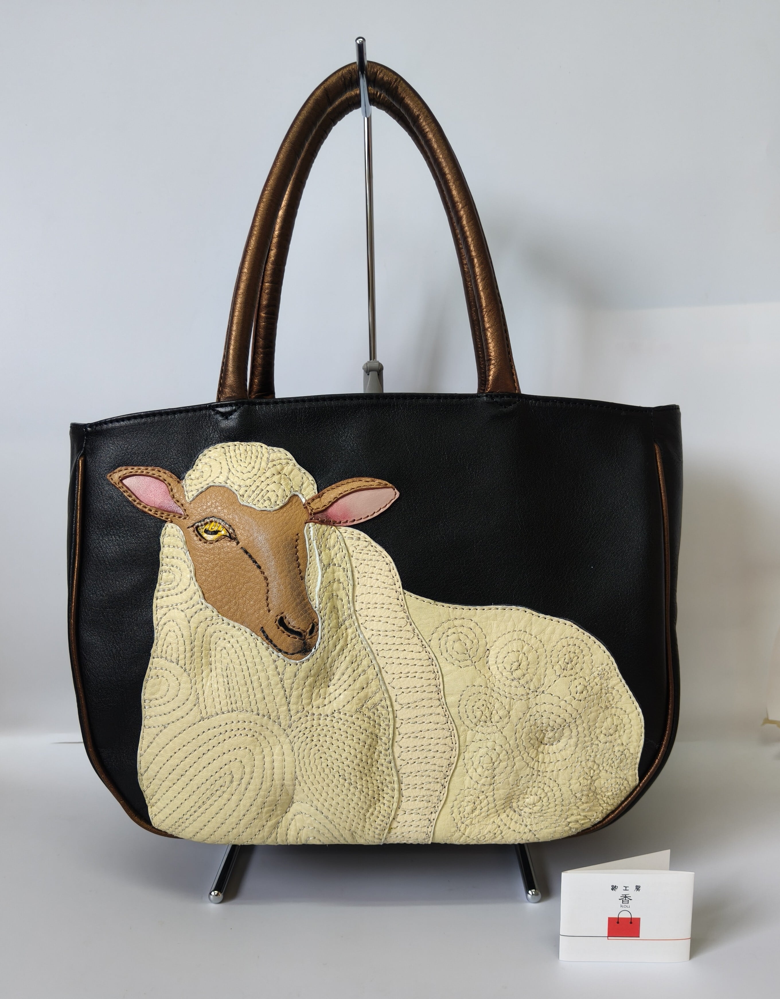 黒地に立体的な羊のモチーフ、ブロンズ色の取っ手やパイピングが